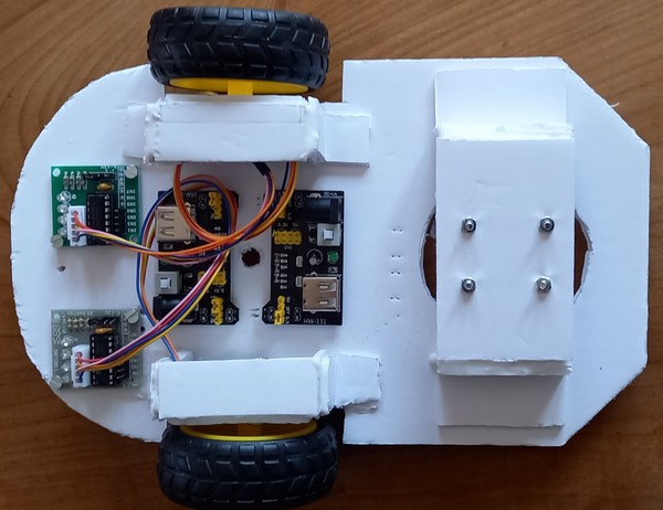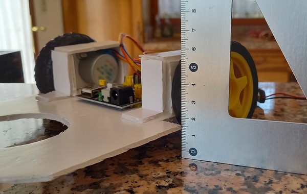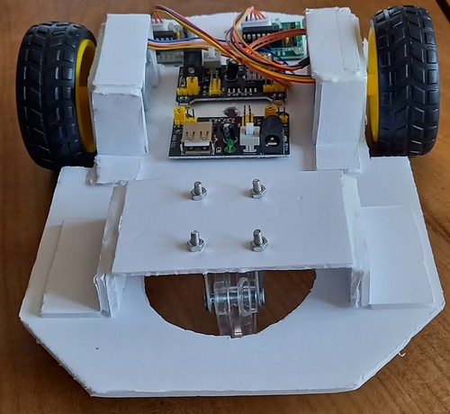 Mise en place de la roue pivotante Il faut construire un support intermédiaire entre les deux plaques support de la tortue pour fixer la roue de manière à ce que les plaques soient horizontales. ![]() La hauteur h des côtés dépend de la hauteur de la roulette. Celle utilisée (vendue chez Mr Bricolage) mesure 3,5 cm de haut. On fixe la roue pivotante à son support par 4 boulons de 3 x 12 mm et 4 écrous. ![]() La hauteur de la plaque maintenue à l'horizontale mesure 1,8 cm par rapport au sol (cette hauteur dépend de la position de l'axe des moteurs dans leur support), ![]() Ici, la hauteur des côtés doit faire : h = 3,5 cm - 1,8 cm = 1,7 cm On fixe le support de la roue pivotante sur la plaque de la tortue de part et d'autre du trou de diamètre 65 par deux pattes : ![]() Ces deux pattes sont à coller sur les côtés du support de la roue pivotante, comme ci-dessous : ![]() Pour finir, il faut coller l'ensemble par les pattes en le centrant sur le trou de diamètre 65 prévu pour que la roue puisse pivoter. ![]() ![]() Support arrière La plaque supérieure sera collée sur le dessus des supports de roue et sur un support arrière qu'il faut maintenant construire. Cette construction est analogue aux supports de roue à partir d'un rectangle de 8,5 cm x 5,4 cm : ![]() Il faut ensuite découper au cutter suivant les pointillés (il y a un décalage de 3mm pour le dessus afin de tenir compte de l'épaisseur du carton mousse) : ![]() Il reste à couper en surface le carton mousse (du côté opposé au pliage) suivant les traits pleins pour pouvoir le plier (ne pas trop appuyer sur le cutter). D'abord les 2 côtés puis le dessus. Coller le dessus sur l'épaisseur des côtés. Puis coller ce support à l'arrière de la plaque inférieure, comme ci-dessous. ![]() Il est inutile de mettre des pattes de renforcement comme pour les supports des roues. |