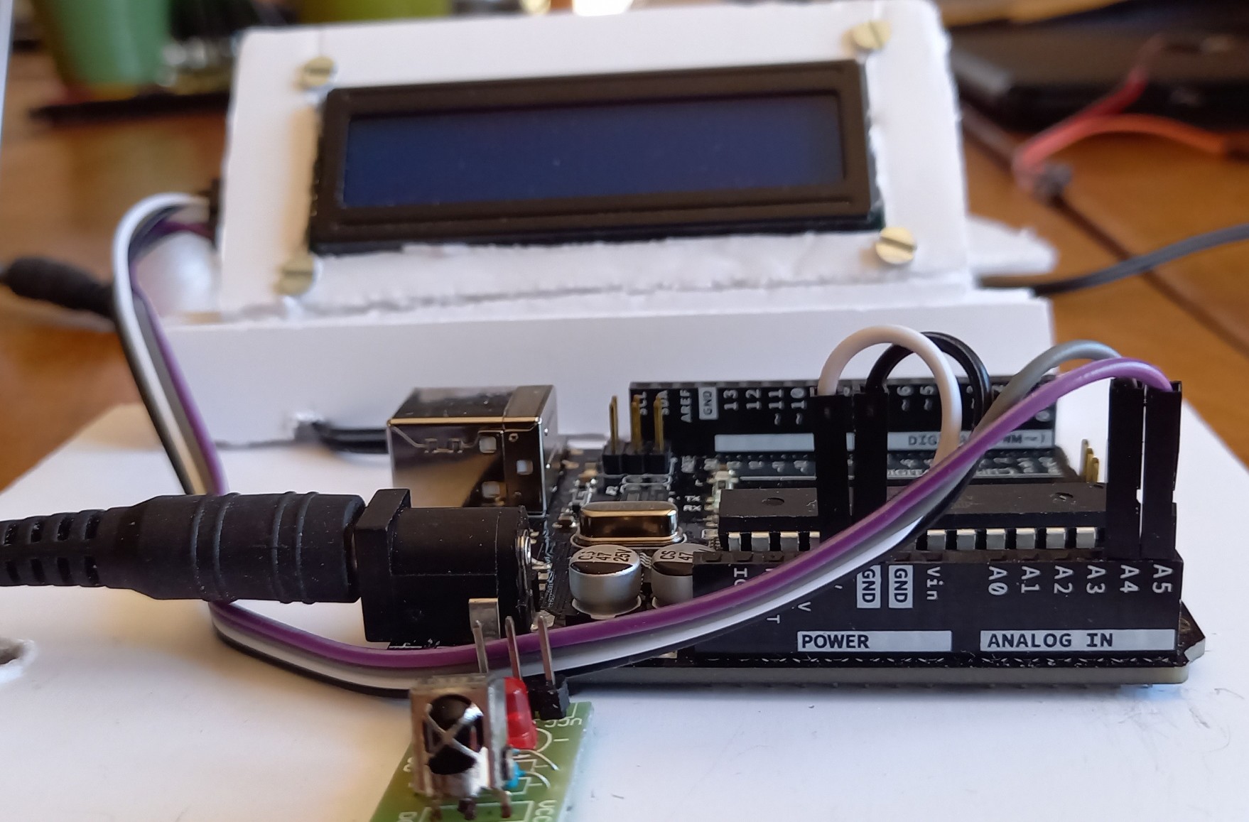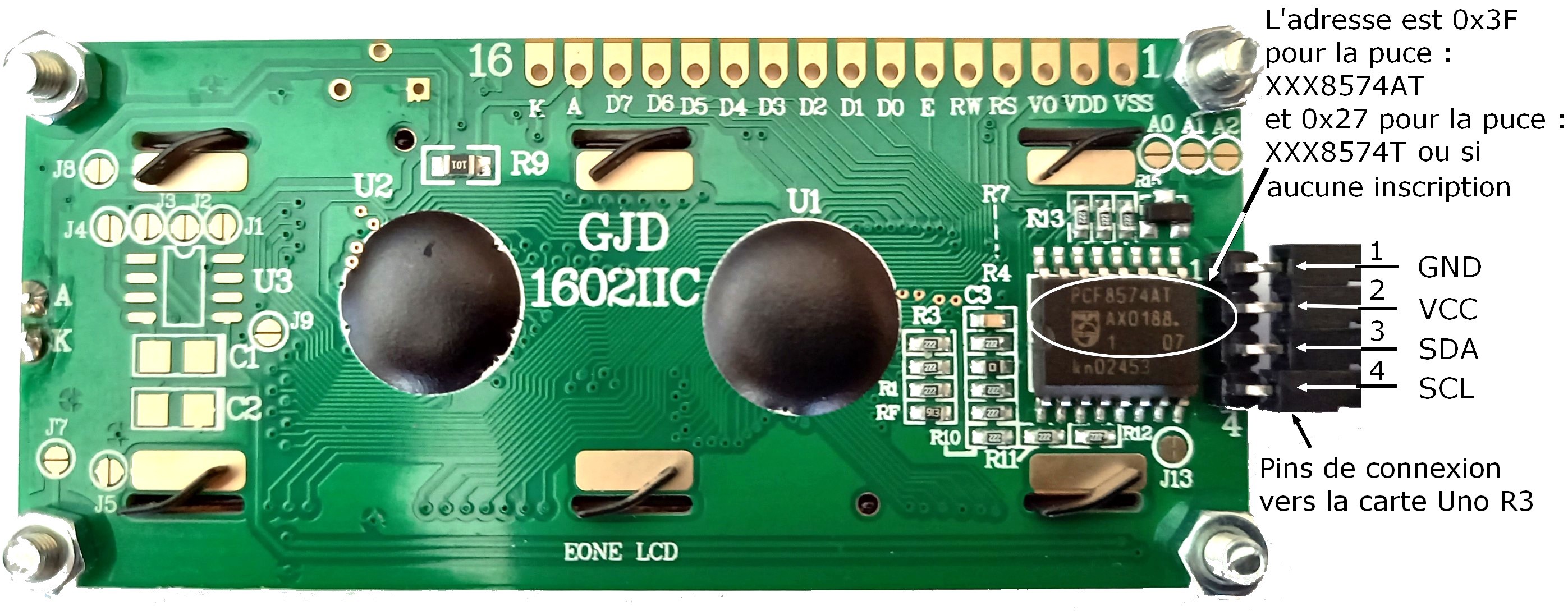Ecran I2C LCD 1602 Cet écran de 2 lignes de 16 caractères permettra de visualiser les commandes entrées par la télécommande dont celles pour diriger la tortue. Pour simplifier le montage, l'écran choisi (FreeNove) est un écran avec une interface I2C (port série) qui ne nécessite que 4 fils. Lorsqu'on est face à l'écran, les pins de connexion doivent se trouver derrière l'écran à gauche. Adresse du port série Sur le dos de l'écran, la puce qui gère l'interface série à une inscription. Suivant celle-ci, l'adresse pour communiquer avec la puce est différente : Il faut mémoriser cette adresse car elle est nécessaire au programme gérant l'affichage sur l'écran LCD. Câblage Le câblage de l'écran avec la carte Uno R3 est facile. Il suffit de brancher le pin 1 (GND) de l'écran à un pin GND de la carte Uno R3. De même, brancher le pin 2 (VCC) de l'écran au pin 5V de la carte. Brancher les pins 3 et 4 (SDA et SCL) respectivement aux pins A4 et A5 de la carte Uno R3. ![]() Logiciel Il faut commencer par télécharger la librairie nommée "LiquidCrystal_I2C" (fichier LiquidCrystal_I2C.zip - 20 ko). Pour installer cette librairie, lancer l'IDE d'Arduino et par le menu Croquis puis Inclure une bibliothèque, cliquer sur Ajouter la bibliothèque.zip et parcourir les dossiers jusqu'au dossier Téléchargements et cliquer sur le fichier LiquidCrystal_I2C.zip. Télécharger le programme : TestEcranLCDSerie (fichier zip - 1 Ko) puis copier ce fichier du dossier Téléchargements vers le dossier Arduino et décompresser le fichier zip. On obtient alors le dossier TestEcranLCDSerie qui contient le fichier TestEcranLCDSerie.ino Lancer l'IDE d'Arduino et par le menu Fichiers puis Ouvrir, parcourir les dossiers jusqu'au dossier Arduino puis TestEcranLCDSerie et cliquer sur le fichier TestEcranLCDSerie.ino Essai de l'écran Brancher le câble USB reliant la carte Uno R3 à l'ordinateur et téléverser le programme TestEcranLCDSerie sur la carte Uno R3. Dès la fin du téléversement, le programme s'exécute automatiquement : |