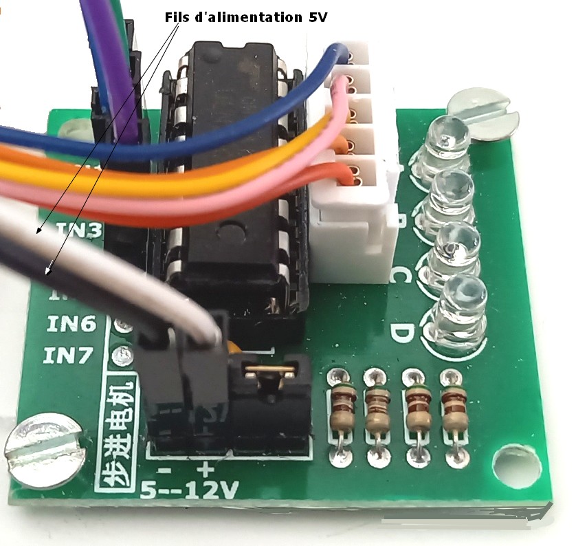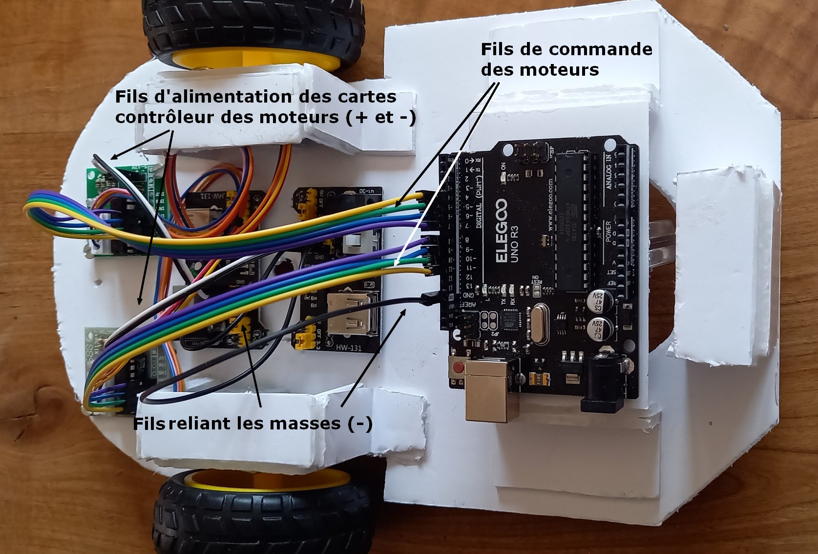 Il faut commencer par relier la masse (- ou GND) entre les deux cartes d'alimentation puis au pin - de chacune des cartes contrôleur des moteurs. Il faut également relier la masse (GND) de la carte d'alimentation à l'une des masses (broche GND) de la carte Arduino. Relier ensuite le + de la carte contrôleur à une des deux pins 5V de la carte d'alimentation. Le câblage des cartes contrôleur des moteurs sur la carte UNO R3 se font (provisoirement du côté de la carte Uno R3) de la manière suivante :
