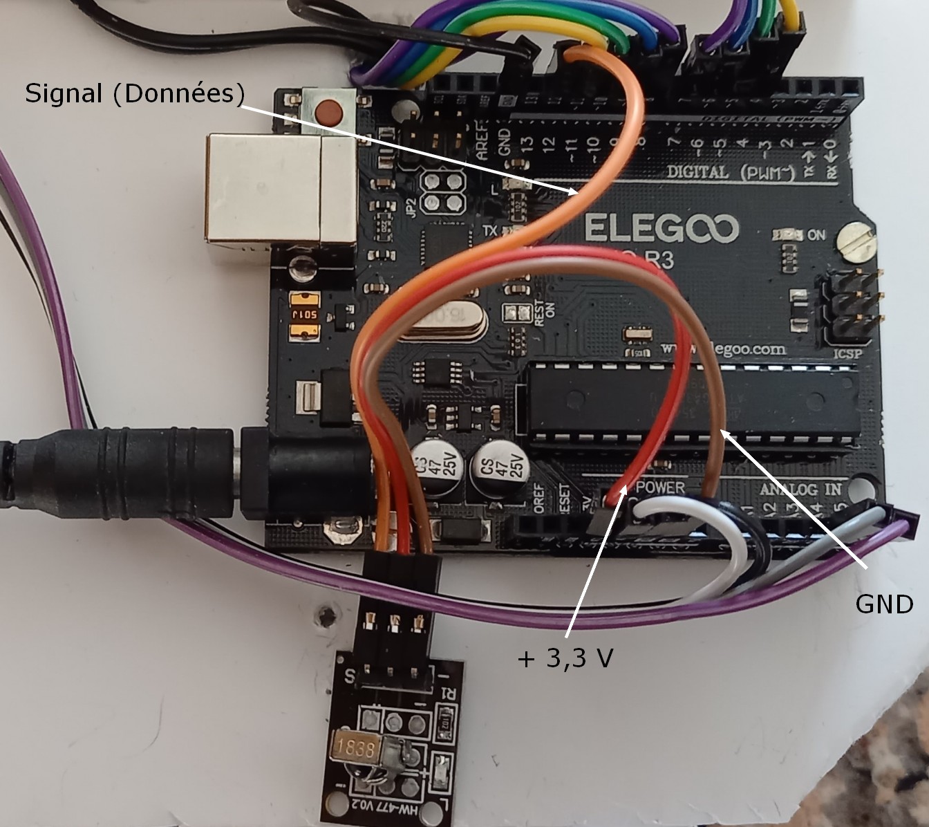 Récepteur Infrarouge Ce récepteur ou capteur infrarouge doit âtre acheté avec la télécommande infrarouge car ils doivent être compatible entre eux (utilisent la même fréquence, en général de 38 kHz). il existe plusieurs pack contenant une télécommande IR, un récepteur IR et des fils de connexion. Les télécommandes ne sont pas identiques d'un fournisseur à l'autre, en particulier le nombre de touche qui varie de 17 à 21 touches (21 touches pour les télécommandes d'Elegoo, celles vendues par Semageek, Go Tronic...). Pour ce projet, une télécommande avec au moins 20 touches est préférable et permettra les commandes en mode direct ou en mode programmation. Avec 17 touches (par exemple la télécommande de Keyestudio), ne sera disponible que le mode programmation (sans instruction de répétition). Câblage du récepteur IR Le récepteur ne comporte que 3 pins : 2 pour l'alimentation (VCC et GND) et un pour les données. Mais attention, tous les récepteur IR compatible Arduino n'ont pas les pins placés de la même maniière (VCC et GND sont parfois inversés). Le capteur utilisé est celui de droite sur la photo ci-dessus : à droite le pin GND à relier à la broche GND de la carte Uno R3, celle du milieu à raccorder au +5V ou +3,3 V de la carte Uno R3 (ici sur +3,3 V car la broche +5 V est déjà utilisée par l'écran LCD) et le dernier, celui à gauche (S) à brancher sur l'une des broches digitales de la carte (ici la 12) : Logiciel Il faut commencer par télécharger la librairie nommée "IRremote" (fichier IRremote.zip - 175 ko). Pour installer cette librairie, lancer l'IDE d'Arduino et par le menu Croquis puis Inclure une bibliothèque, cliquer sur Ajouter la bibliothèque.zip et parcourir les dossiers jusqu'au dossier Téléchargements et cliquer sur le fichier IRremote.zip. Télécharger le programme : TestIRAvecEcranSerie (fichier zip - 1 Ko) puis copier ce fichier du dossier Téléchargements vers le dossier Arduino et décompresser le fichier zip. On obtient alors le dossier TestIRAvecEcranSerie qui contient le fichier TestIRAvecEcranSerie.ino Lancer l'IDE d'Arduino et par le menu Fichiers puis Ouvrir, parcourir les dossiers jusqu'au dossier Arduino puis TestIRAvecEcranSerie et cliquer sur le fichier TestIRAvecEcranSerie.ino. Essai du capteur IR et visualisation du code des touches Brancher le câble USB reliant la carte Uno R3 à l'ordinateur et téléverser le programme TestIRAvecEcranSerie sur la carte Uno R3. Dès la fin du téléversement, le programme s'exécute automatiquement. Le programme attend qu'une touche de la télécommande soit enfoncée et affiche alors le code de la touche : ![]() Ce programme permet de connaître le code envoyé par chaque touche de la télécommande. Avec la télécommande d'Elegoo, la télécommande Carmp3, et celle de Joy-it (vendu par Go Tronic), les codes des 21 touches sont les mêmes. Pour la télécommande de Keyestudio le code des 17 touches correspondent aux codes des touches se trouvant à la même place. Les codes sont indiqués dans le tableau ci-dessous :