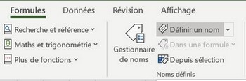 NOMMER UNE PLAGE DE CELLULES Après avoir sélectionné la plage de cellule, cliquer sur l'onglet Formules, puis dans le groupe Noms définis, cliquer sur la commande Définir un nom. Dans la boîte de dialogue obtenue : Dans le champ Nom écrire : a (comme ci-dessus). Dans le champ Zone, dérouler la liste et choisir Feuil1 (le nom sera reconnu dans la première feuille du classeur et non dans tout le classeur) Vérifier aussi dans le champ du bas (Fait référence a :) que la plage indiquée est bien celle voulue (précédée du nom de la feuille dans le classeur). Cliquer sur le bouton OK, le nom est ajouté à la liste des noms de la feuille.