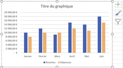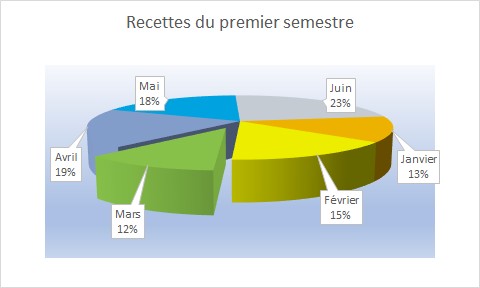 Lorsque le graphique est sélectionné, un nouvel onglet Création de graphique apparaît. En cliquant sur ce nouvel onglet, on obtient le ruban suivant : ![]() Ce ruban permet de changer rapidemment avec aperçu un certain nombre d'élements du graphique comme ajouter un élément au graphique, modifier la disposition, la couleur des séries, le style du graphique, etc. Lorsque le nombre de lignes est inférieur au nombre de colonnes ou pour des graphiques plus sophistiqués, il vaut mieux cliquer sur Graphiques recommandés soit la premiere commande du groupe Graphiques. Excel proposera tous les types de graphique adaptés aux données à représenter. Un fois le graphique choisi, il apparaîtra comme le diagramme à barre ci-dessus. On peut aussi vérifier ou préciser le statut de la première colonne (ici elle contient les étiquettes de l'axe des abscisses), il faut donc vérifier ou remplir la plage pour les étiquettes des abscisses (X). Pour cela cliquer sur le bouton ![]() Dans cette boîte de dialogue, on peut tout modifier. En haut la plage de données du graphique modifiable par la petite flèche à droite, en dessous à gauche la légende des séries et à droite les étiquettes de données. Les boutons Modifier de ces deux zones permettent de sélectionner les cellules qui semblent mieux adaptées Les éléments d’un graphique Un graphique Excel comprend plusieurs éléments : ![]() En cliquant avec le bouton droit de la souris sur la zone de traçage du graphique apparaît une mini barre d’outils en haut et un menu contextuel en dessous : ![]() La liste déroulante à droite dans la barre d'outils permet de sélectionner directement l’un des éléments du graphique (ce qui n’est pas toujours facile par un clic de souris) : ![]() Modifier un graphique Le type de graphique peut être changé, après coup. Pour cela, rendre actif le graphique par un simple clic, puis par le menu contextuel (obtenu en cliquant avec le bouton droit sur la zone du graphique ou la zone de traçage), choisir l’option Modifier le type de graphique. Une boîte de dialogue apparaît et donne le choix avec aperçu entre plusieurs graphiques recommandés ou (par un deuxième onglet) donne accès à tous les graphiques Par exemple, on change le graphique précédent en diagramme à secteurs 2D ou 3D (onglet Tous les graphiques) mais dans ce cas on ne peut représenter qu'une série, par défaut la première : les recettes (on peut ensuite modifier ce choix). Pour avoir l’indication des pourcentages avec le nom de chaque série, sélectionner le graphique et dans la barre verticale de trois boutons qui apparaît, cliquer sur le bouton ![]() Puis cliquer sur la flèche qui apparaît à la suite de la case Etiquettes de données puis dans la liste cliquer sur Légende de données. Par la même occasion on peut décocher Légende sous Etiquettes de données qui ne donne plus d'informations supplémentaires. On obtient le graphique ci-dessous. Exemple 2 (diagramme circulaire) ![]() Exemple 3 (histogramme)