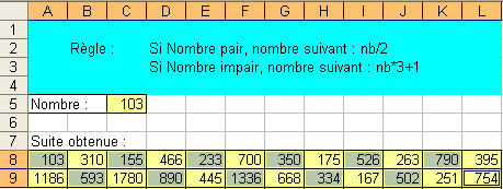 On doit obtenir l'effet désiré (voir correction). Remplacer maintenant le nombre 103 dans la cellule C5 par 93 puis 91 ou tout autre nombre. Obtient-on toujours, plus ou moins rapidement, la même séquence 4, 2, 1 ? Sauvegarder le fichier sous le nom : TableurExercice4. Passer à l'exercice 5. |