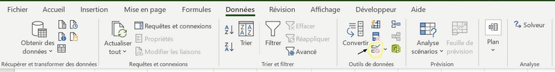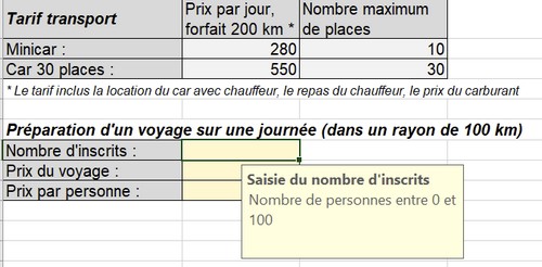 On peut créer un contrôle de saisie dans la cellule B7 (nombre d'inscrits), pour cela il faut d'abord se positionner dans la cellule B7 et avec Excel, cliquer sur l'onglet Données puis dans le groupe Outils de donnéescliquer sur l'outil Validation (indiqué pr une flèche ci-dessous). Avec Calc d'OpenOffice, cliquer dans le menu Données sur Validité.