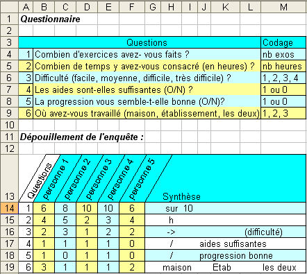 ![]() Commencer par faire la partie Dépouillement de l'enquête (lignes 11 à 19) avec les largeurs appropriées des colonnes de A à M (la synthèse comprend 7 colonnes de G à M). Remplir le tableau avec les données ci-dessus (la colonne G est réservée aux résultats, la colonne H aux textes centrés : "sur", "h", "->", "/", "/" et au texte "maison" aligné à gauche qui déborde dans la cellule I19, la colonne I contient 10, la colonne J contient les textes "aides suffisantes" et "progression bonne", la colonne K contient le texte "Etab", la colonne L contient le texte "(difficulté)" et la colonne M contient le texte "les deux".. La partie Questionnaire n'est qu'informative, il n'est pas necessaire de la reproduire. Pour avoir les libellés obliques sur la ligne 13, sélectionner la plage de cellules A13:F13 puis dans le menu contextuel obtenu avec le bouton droit de la souris, cliquer sur Format de cellule puis dans l'onglet alignement régler l'orientation à 60°. Passer ensuite à l'étape 2. |