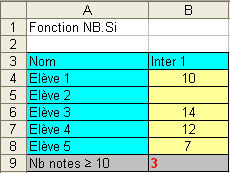 Exemple ![]() La formule en B11 est : =SOMME.SI(B4:B8;"=O";A4:A8) Fonction NB.SI Syntaxe NB.SI(argument1;argument2) où : - argument1 est la plage des nombres à compter - argument 2 est le critère (sous forme de texte) selon lequel les nombres seront comptés Exemple ![]() La formule en B9 est : =NB.SI(B4:B8;">=10") |