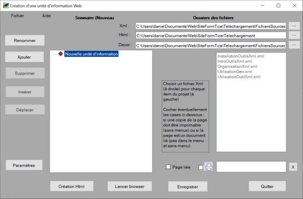 Une fois le dossier choisi et validé, la fenêtre d'OutilXml apparaît comme ci-dessous : ![]() Dans cette fenêtre apparaît, à droite, la liste des fichiers Xml. À gauche, une zone est réservée au sommaire avec la racine (Nouvelle unité d'information) à renommer. Au dessus, trois champs qui sont en princpe remplis automatiquement (si on a respecté l'rganisation recommandée) affichent respectivement le chemin :