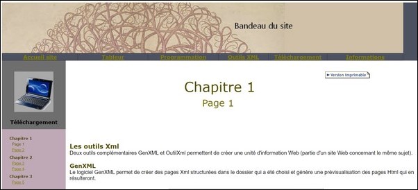 ![]() On peut modifier le sommaire à tout moment avec les boutons : Renommer, Ajouter, Supprimer, Insérer. On peut également déplacer toute une partie du sommaire par le bouton Déplacer mais uniquement avant d'avoir lié des éléments du sommaire à des fichiers Xml. Le bouton Paramètres permet de documenter le fichier de sauvegarde du projet en y incluant un titre et un résumé. Il est conseillé de faire régulièrement une sauvegarde du projet en cliquant sur le bouton Enregistrer. Association des éléments du sommaire aux fichiers Xml Il suffit de sélectionner un élément du sommaire (autre que la racine) et de cliquer sur un document Xml dont le nom du fichier apparaît dans la liste de droite. Le nom du fichier choisi apparaît alors dans un champ sous la liste : ![]() On peut rendre cette future page Html imprimable (une copie sans sommaire pourra être affichée par le bouton On peut avoir des documents liés à tous les niveaux (le troisième niveau ne pouvant servir qu'aux documents liés). Si l'élément sélectionné du sommaire est un document lié, il faut cocher la case □ Page liée. Génération des pages Html Une fois tous les fichiers Xml associés à un élément du sommaire, on peut procéder à la génération des pages Html de cette nouvelle unité d'information. Il suffit de cliquer sur le bouton Création Html situé sous le sommaire. En cliquant sur ce bouton, on voit le sommaire être parcouru par la sélection de chaque élément jusqu'à l'élément final. Si une erreur est détectée dans un fichier Xml, elle est signalée et (sauf erreur mineure) le parcours des éléments s'arrête sur l'élément associé à ce fichier. Lorsque tous les fichiers Xml ont été traités (la sélection reste sur l'élément final), on peut afficher cette unité d'information (en commançant par le premier élément du sommaire associé à un fichier Xml) en cliquant sur le bouton Lancer browser : ![]() Suivant le nombre de niveau utilisé et les associations faites, on obtient différents types de sommaire. |