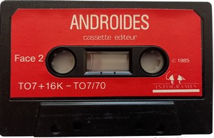 Androïde ANDROIDES (du grec ANDROS : homme et EIDOS : aspect) : ce qui a FORME HUMAINE. Ce jeu d'arcade créé par William Hennebois (100% langage machine) a été édité par Infogrames en 1985 pour TO7 + 16 K, TO7-70 et MO5. Il a été retenu (version TO7) par le Ministère de l'Education Nationale pour le plan IPT. Une version pour MO5, MO6, TO7-70, TO8, TO9 et TO9+ est parue en 1986 rendant les manettes de jeu obligatoires.