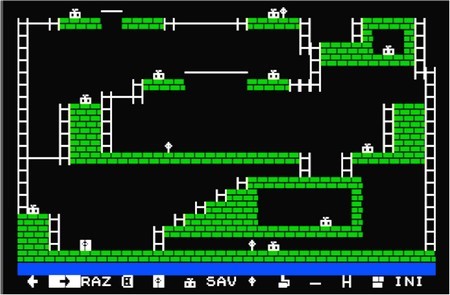 On peut alors créer de nouveaux tableaux avec la touche [RAZ] ou modifier des tableaux existants avec la touche [CNT]. Après avoir sélectionné le mode création ou édition, l'écran se divise en deux parties séparées par une ligne bleue. En haut se trouve le tableau à construire et en bas, les fonctions de l'éditeur : On se déplace dans toutes les directions avec les touches fléchées ou la manette de jeu. Pour valider une fonction ou un élément de construction, il faut appuyer sur la barre d'espacement ou sur le bouton ACTION de la manette de jeu. Liste des fonctions :