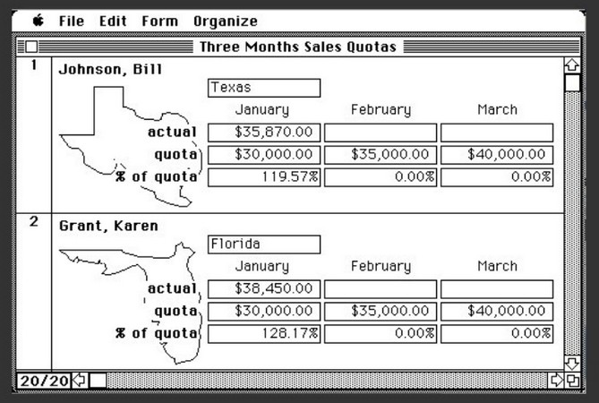 4D est un système de gestion de base de données relationnelle disposant d'un langage de programmation de la quatrième génération (L4G) et d'un environnement de développement intégré (EDI ou IDE en anglais) Actuellement la dernière version (4D v17) a été publiée en 2018. Microsoft File En janvier 1985, Microsoft sort son logiciel "File" pour Macintosh, un "Data Management Program" qui est un simple gestionnaire de données (type Feuille de données comme dans Excel)