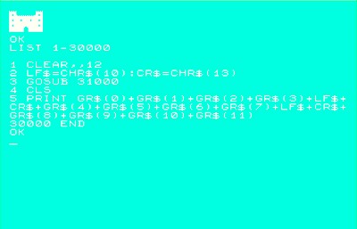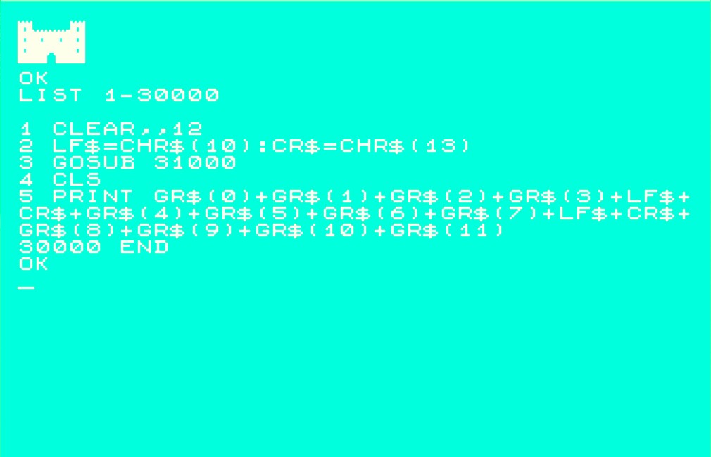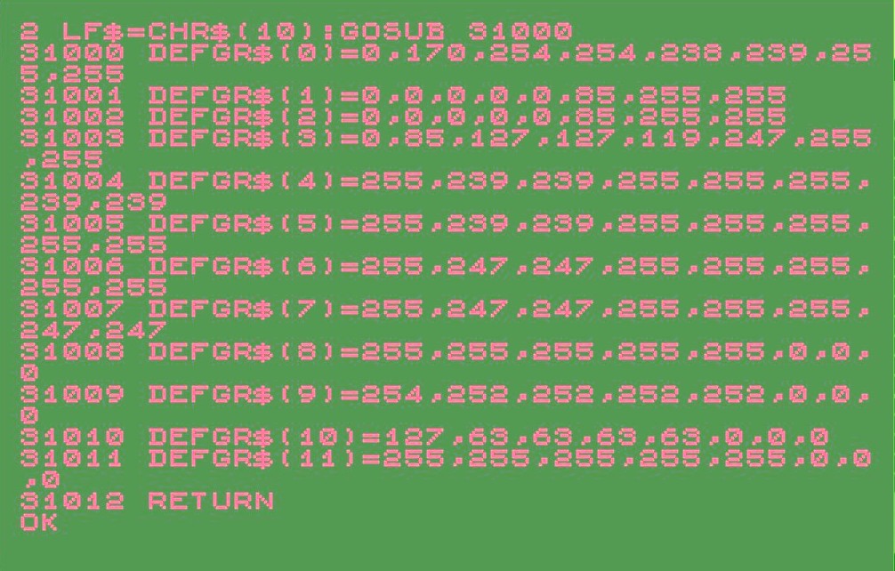 Ci-dessous sauvegarde au format Basic. Il s'agit d'un sous-programme (ligne 31000) qui doit être appelé par l'instruction GOSUB et qui finit par RETURN. Le programme qui utilise ces définitions graphiques doit commencer par la ligne 2 puis utiliser les instructions Print GR$(0) + GR$(1) ... pour afficher l'image (avec LF$ + CR$ pour retour en début de ligne) sans oublier de placer l'instruction END avant la ligne 31000.