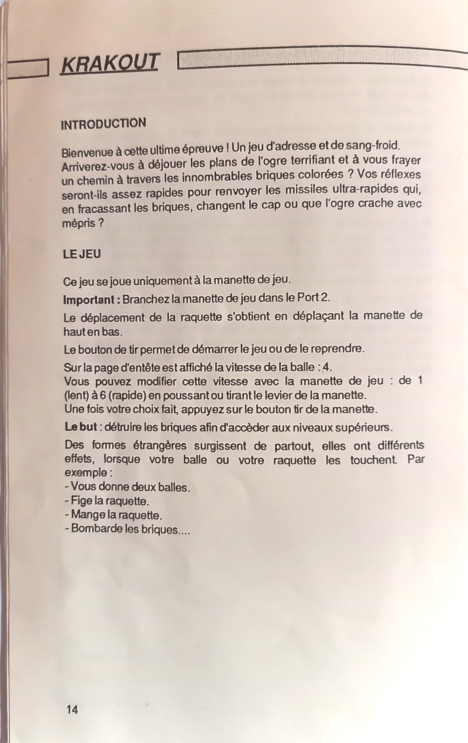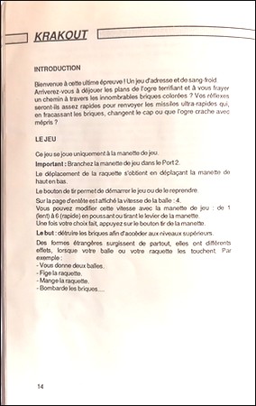 Krakout Ce jeu d'adresse et de sang froid (casse-briques revisité) a été créé par Gremlin Graphics en 1987. Il se joue uniquement à la manette de jeu.