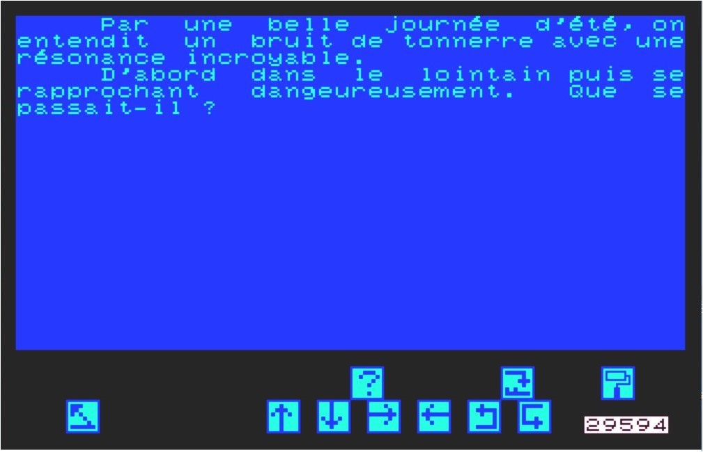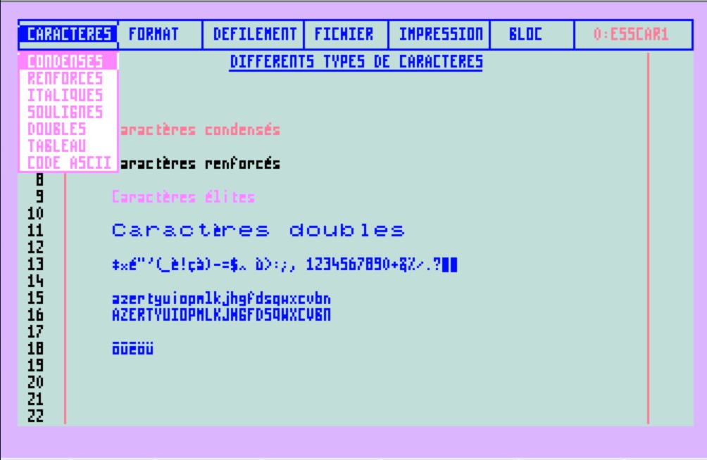 Les menus, situés en haut de la page, étaient accessibles par la touche @ du clavier. Le menu CARACTERES permettait différentes écritures : Par le menu FICHIER, on pouvait sauvegarder ou ouvrir un texte, importer ou exporter une partie d'un texte. Le document réalisé pouvait être imprimé par le menu correspondant. Ce « Traitement de texte à Grande Vitesse », disponible sur toute la gamme Thomson, était simple à utiliser et performant. |
