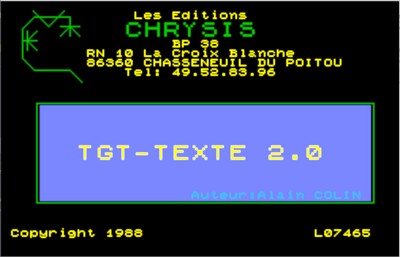 Une fois le texte saisi, il est possible de faire une mise en page en définissant les marges puis de l'imprimer en numérotant les pages et de le sauvegarder sur disquettes ou cassettes. Paragraphe Il a été édité en 1986 par FIL (puis Profil) et ne fonctionne que sur TO8 et TO9. C'est un traitement de texte de type « WYSIWYG » (What you see is what you get, c’est-à-dire : ce que tu vois est ce que tu obtiens) avec menus déroulants et pictogrammes. Il travaille en mode 40 colonnes mais a la possibilité de fonctionner en 80 colonnes. Ce traitement de texte utilise les touches de fonction du TO8, la souris ou le crayon optique. Il peut importer des textes ou dessins venant d'autres logiciels (Scriptor, Colorpaint, Caractor, ...) et on peut aussi redéfinir sa propre police de caractères. En revanche, il n'y a pas de fonction d'encadrement ni d'application de mailing. De plus, un certain nombre d'options ne sont utilisables qu'avec une imprimante Thomson. C'est donc un traitement de texte puissant et rapide offrant un nombre important de possibilités avec une imprimante Thomson et qui se trouve à la limite du logiciel professionnel. Il semble bien adapté avec la configuration TO8D, souris ou crayon optique et imprimante Thomson. TGV Texte Traitement de texte développé par Alain Colin et édité par Chrysis en 1988 pour les ordinateurs MO5, TO7/70, MO6 et TO8. Une version nommée « TGT-Texte » était également disponible pour le Nanoréseau. Cette version incluait le traitement de texte, une saisie de données (analogue au traitement de texte mais sans mise en forme des caractères) et un mailing.