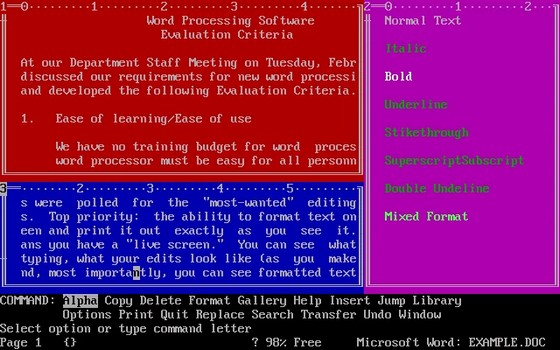Il a rapidement remplacé la plupart des autres systèmes, en particulier après la sortie WordStar 4.2 en 1986, et il est devenu la norme sur le marché MS-DOS avec la version 5.1 parue en 1989. Sa popularité précoce était basée en partie sur sa disponibilité pour une grande variété d’ordinateurs et de systèmes d’exploitation (version pour Apple II en 1985, pour Amiga en 1987, Macintosh en 1988 et système UNIX également en 1988) Sa position dominante a pris fin après une sortie ratée pour Microsoft Windows en 1991, suivie d’un long délai avant l’introduction d’une version améliorée, car Microsoft Word a été introduit dans la même période avec un design supérieur. Word a rapidement pris le contrôle du marché et WordPerfect n’était plus la norme au début des années 1990. WordPerfect Corporation a été vendue à Novell en 1994, qui a ensuite vendu le produit à Corel en 1996. Corel a apporté des versions régulières au produit depuis lors, souvent sous la forme de suites bureautiques sous le nom Corel WordPerfect Office qui incluent la feuille de calcul Quattro Pro, le formateur de diapositives Presentations et d’autres applications. Textor Textor est un logiciel de traitement de texte professionnel développé dans les années 1980 par Computer Associates pour le système d'exploitation Microsoft MS-DOS. Le logiciel fonctionnait en mode texte sur MS-DOS jusqu'à sa cinquième version majeure puis la version 6 apporta en 1992 une intégration en mode graphique sous Windows 3.x. Ce logiciel était en concurrence directe avec ses homologues WordPerfect et Microsoft Word sans toutefois connaître un succès similaire. N'ayant pu prendre une part de marché significative dans la bureautique en mode graphique sous Windows, Computer Associates se concentra sur d'autres marchés et abandonna le développement du logiciel. Microsoft Word Sa première version a été distribuée en 1983 sous le nom de Multi-Tool Word (« Multi-Outil de traitement de texte ») pour le système d'exploitation Xenix qui était une version du système Unix à la fin des années 1970. Des versions ultérieures furent écrites pour plusieurs autres plates-formes dont IBM PC sous système d’exploitation DOS en 1983, Apple Macintosh en 1984, SCO UNIX, OS/2 et les premières versions Windows en 1989. Word pour DOS fut le premier logiciel de traitement de texte populaire pour compatibles PC à utiliser le mode graphique pour montrer immédiatement les mises en forme. Word a été intégré en tant qu’élément de la suite Microsoft Office depuis 1993, même s’il était également vendu seul ou inclus dans la suite Microsoft Works.