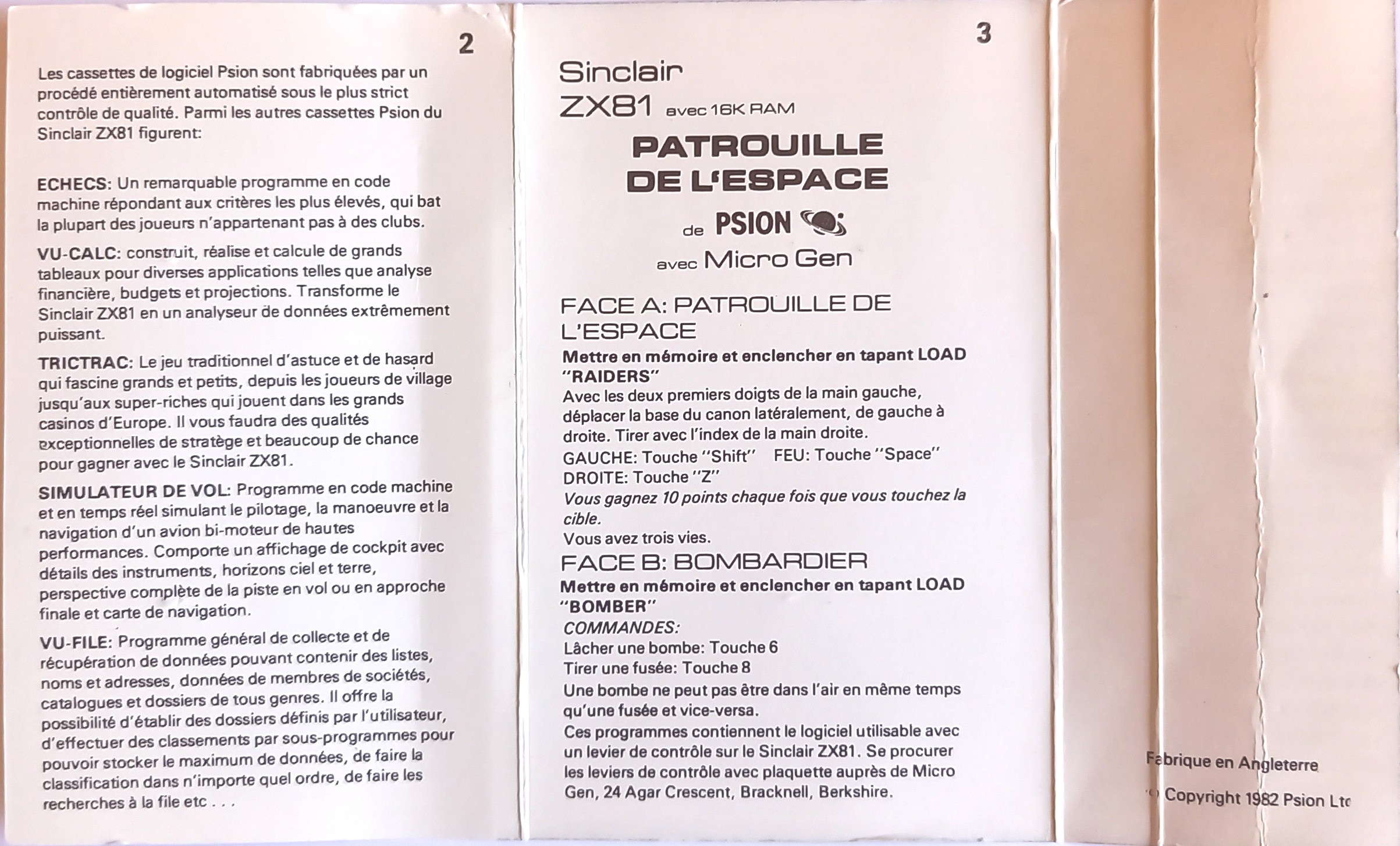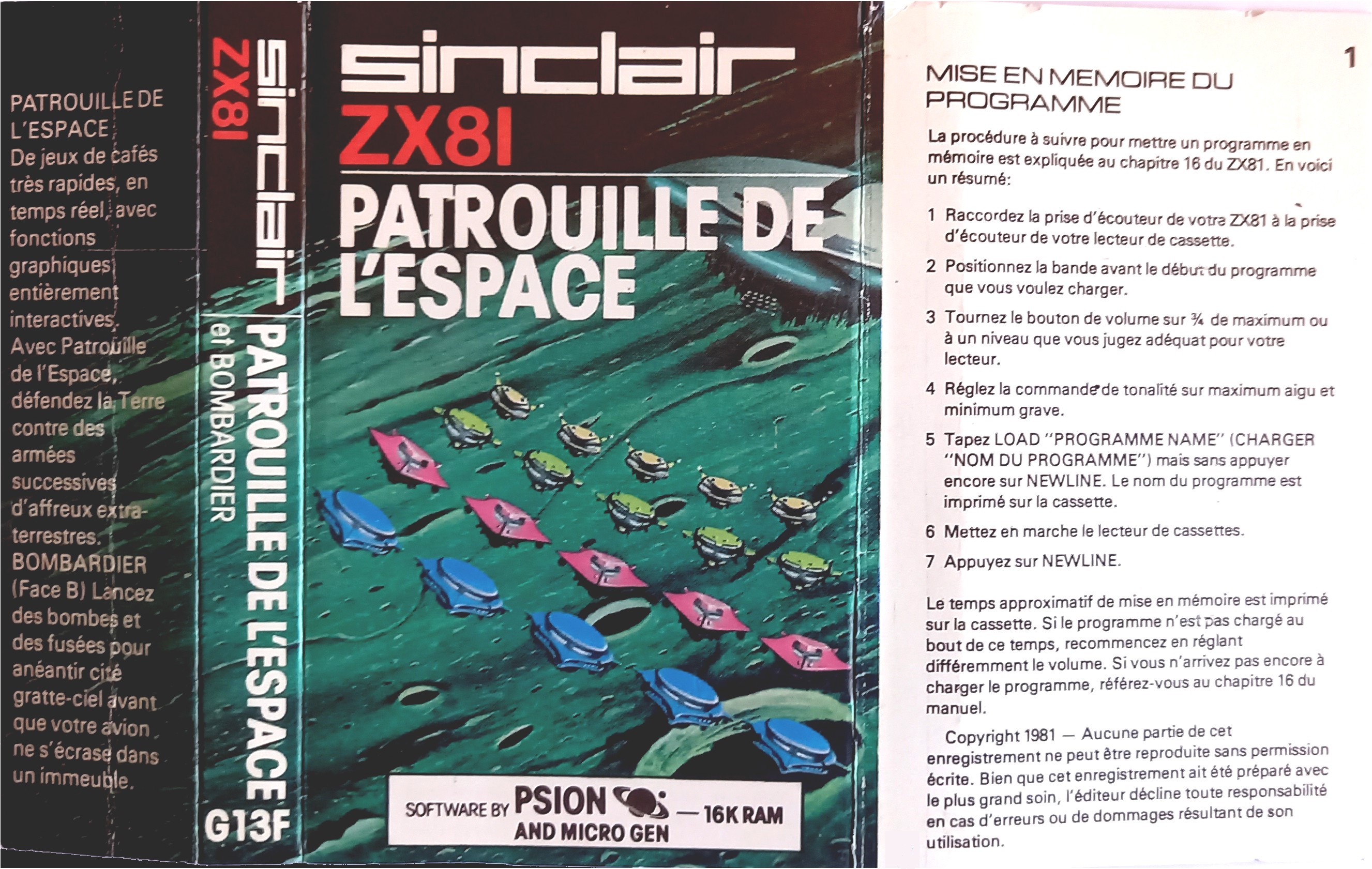 Patrouille de l'espace Cette cassette pour Sinclair ZX81 (muni d'une extension mémoire de 16 ko) contient deux jeux : Patrouille de l'espace (RAIDERS) et BOMBARDIER (BOMBER). Ces programmes ont été créé par Psion LTD et Micro Gen en 1981.