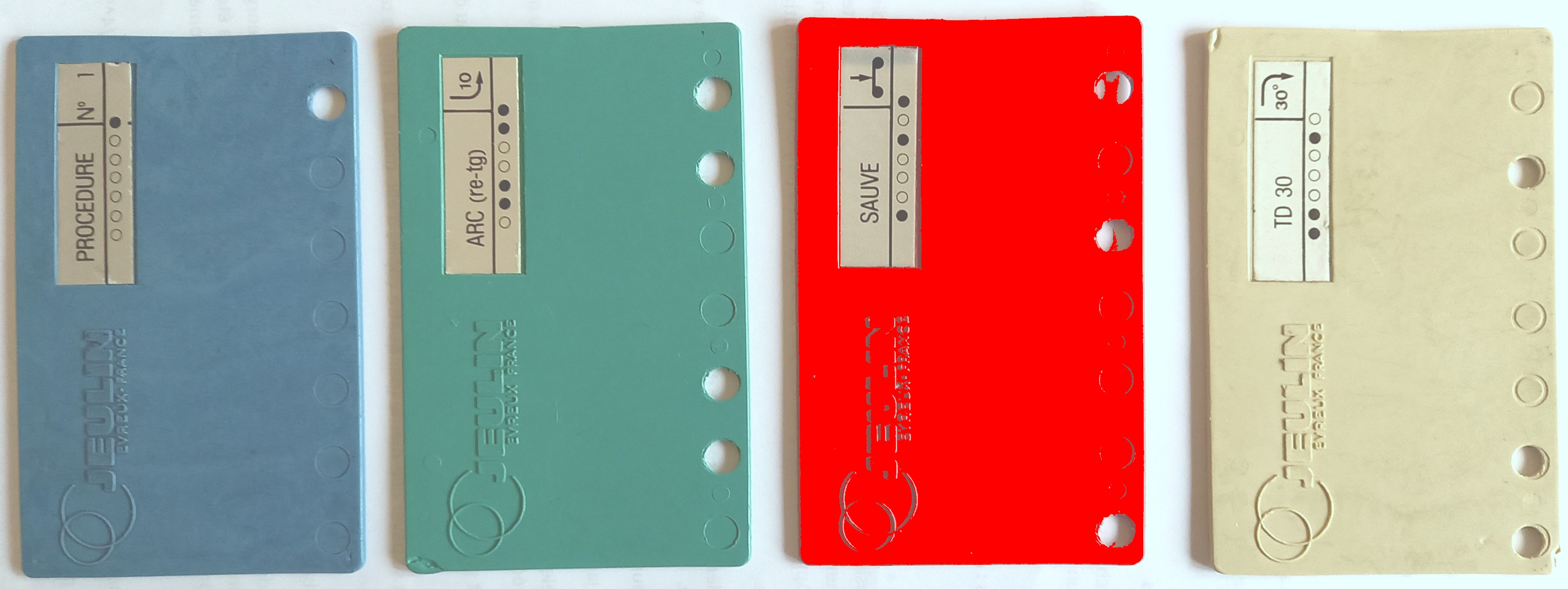 Commande par cartes Il y a quatre sortes de carte, chaque catégorie ayant une couleur spécifique (beige, verte, bleue, rouge) Les cartes de couleur beige sont des cartes de commande directe (AV, RE, TD, TG, ALLUME, ...), les cartes vertes sont des cartes de commande pour les arcs de cercle (ARC td-av, ARC tg-av, ...), les cartes Bleues sont des cartes de procédure et les cartes rouges sont des commandes système (SAUVE, EFFACE, VERIFIE, APPRENDS, EXECUTE ...) Chaque carte de commande ou de procédure est codée sur 7 bits matérialisés par des trous ou manque de trous (1 ou 0) en bas de chaque carte. Comme il y a environ 70 cartes, le codage sur 7 bits était nécessaire (le codage sur 6 bits n'aurait pu convenir que pour 64 cartes)