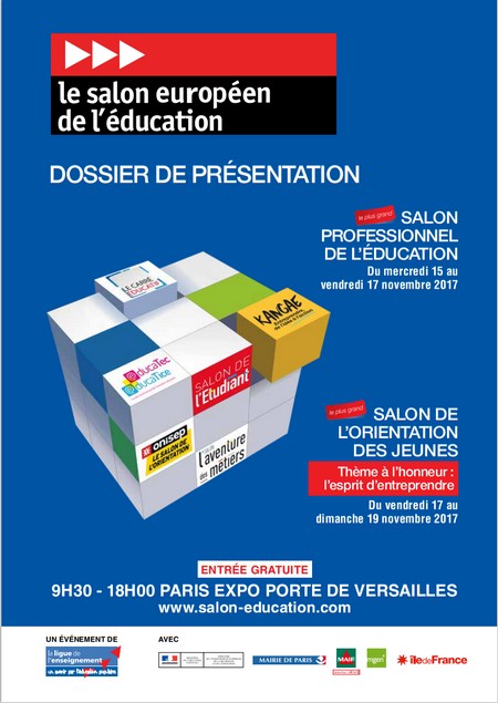 Le salon européen de l'enseignement Le Salon européen de l'éducation est une exposition destinée au monde de l'éducation qui se déroule à Paris chaque année. Le salon est organisé par la Ligue de l'enseignement et il rassemble les étudiants et les professionnels de l'éducation pendant 4 jours chaque mois de novembre. Il est soutenu par :