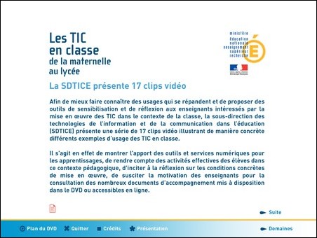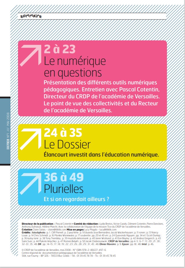 Les scénarios et vidéos étaient libres pour tout usage pédagogique, scientifique ou documentaire et à titre strictement non commercial. Intertice 2008 La 4ème édition d’Intertice, le carrefour des usages numériques en Ile-de-France, montrait le foisonnement des outils, des technologies, des applications et des usages. La diversité des acteurs aussi, avec les quelque 1500 inscrits, qui ont pu se retrouver, se reconnaître et échanger sur les évolutions des usages et les conditions de leur généralisation dans l’école. Cette année, les organisateurs inauguraient une formule sur 2 jours : davantage de conférences, d’ateliers, d’animations, mais toujours le très beau cadre du centre des congrès et de l’espace carrefour numérique de la Cité des sciences et de l’industrie. C'est un salon, plutôt ciblé sur une offre tous azimuts que sur des réponses à des demandes spécifiques. Ce qui se traduit par la grande variété des intervenants et des exposants (des constructeurs comme Intel ou les fabricants de Tableau Numérique Interactif (TNI), des associations comme Sesamath, des groupes d’enseignants comme ceux qui présentaient l’application Euler ou qui représentaient le pôle de compétences des logiciels libres ou des représentants institutionnels tels les CRDP, le CLEMI), sans oublier les stands des organisateurs (les trois académies et la région Ile-de-France) ni même celui de la sous-direction TICE du ministère de l’Éducation Nationale. Le n°1 de la revue Doctice, distribué gratuitement à l’entrée de la manifestation, réalisé par Intel et le CRDP de l’académie de Versailles orientait le visiteur sur les usages et outils en vigueur « à l’école numérique », Tableau Numérique Interactif (TNI), Baladodiffusion, Classe nomade, Cube TICE (outil qui permet de lire des dvd, d’écouter de la musique ou de projeter des images contenues sur une simple clé USB), Visioconférence, Espace numérique de travail (ENT), ...