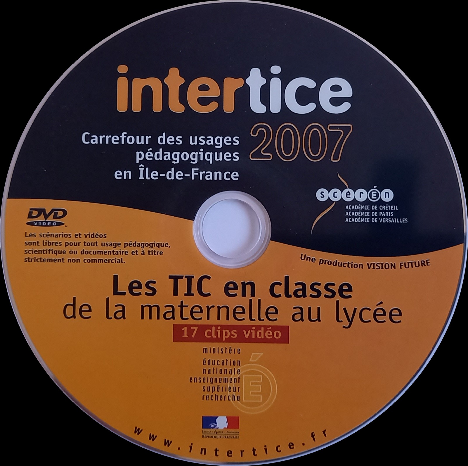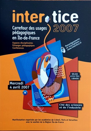 Pour la première fois, il y avait un point de rencontre des personnes- ressources TICE (avec le soutien d'Intel) Les conférences et tables rondes avaient pour thèmes "L'éducation citoyenne sur le Net", "Les Tice, de la maison à l'école", "Tice et Langues" et "Les environnements numériques de travail". Intertice 2007 Troisième manifestation des trois académies autour de pratiques pédagogiques. Intertice a pour objectif de créer une dynamique pédagogique fondée sur l’utilisation de nouveaux matériels. Depuis trois ans, cette manifestation s’avère être un point d’appui pour développer un travail coopératif et favoriser les initiatives communes des divers groupes pédagogiques d’intégration des TICE. Ainsi, les stands disciplinaires sont organisés conjointement, les propositions d’activités sont régulées sans encombre et les participants commencent à bien se connaître et à prendre des initiatives d’animation sur les stands, pour être en contact le plus direct possible avec les visiteurs. Un CD-Rom était disponible dans lequel la sous-direction des technologies de l’information et de la communication dans l’éducation (SDTICE) présentait une série de 17 clips vidéo illustrant de manière concrète différents exemples d’usage des TIC en classe. En plus de ces vidéos, le CD-Rom contenait les documents relatifs aux séquences pédagogiques et des interviews de Professeurs et d'élèves.
