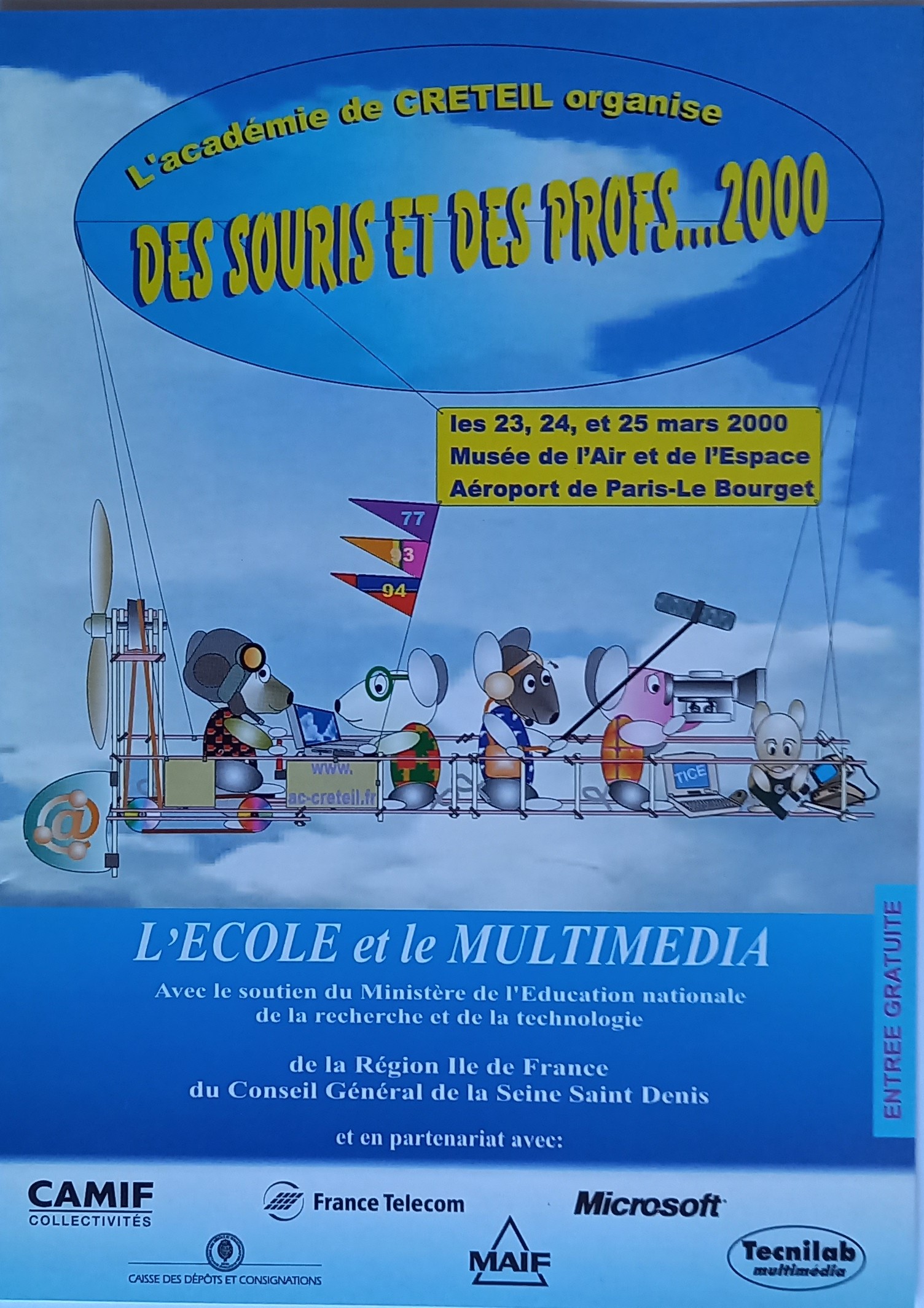 Des souris et des profs ... 2000 C'était la première manifestation pour les Tice organisée par la mission nouvelles technologies du Rectorat de Créteil. Elle a eu lieu, 15 ans après le plan IPT, dans le cadre prestigieux du Musée de l'Air et de l'Espace à l'aéroport de Paris-Le Bourget les 23, 24 et 25 mars 2000. C'était un salon du multimédia où de nombreux constructeurs, distributeurs, éditeurs de logiciels et de cédéroms exposaient. Avec une sélection de produits informatiques et audiovisuels adaptés à l'enseignement, il était un lieu de découverte des versions les plus récenes. Des souris et des profs ... 2000 présentait le développement dans l'académie du multimédia, de l'audiovisuel, de l'informatique et d'internet. Un espace premier degré était animé par des enseignants et des élèves autour de logiciels, de cédéroms, de journaux scolaires ...Et, pour chaque discipline de l'enseignement secondaire, on pouvait rencontrer des professeurs spécialistes des produits et de leurs usages. Une place particulière était faite à l'enseignement technique et professionnel. En effet, toutes les activités du monde tertiaire et industriel traitent des données, utilisent et produisent des images numériques. Celles-ci prennent place parmi de nombreux modèles : maquettes, prototypes, photos, dessins, croquis, schémas, graphes, organigrammes. Un espace était réservé aux débutants en matière de TIC. Des animateurs les accompagnaient dans leurs premiers pas. Un espace de la presse à l'école réalisait en direct des animations : concours de "une", journal du salon. Un espace éducation à l'image et aux médias exposait comment dans l'académie de Créteil, on préparait les jeunes à la compréhension et à la maîtrise d'un environnement médiatisé. Un espace langue en pleine mutation vers le multimédia. Un espace Internet qui s'ouvre au monde entier à côté de l'espace visio-enseignement. Un centre de documentation multimédia pour une navigation à la recherche de l'information, pour la consultation de cédéroms sur la littérature, le cinéma, les sciences ... pour l'accès aux outils d'aide à l'orientation et à l'insertion sociale et professionnelle. Dans le cadre de cette manifestation, Médialog publiait un numéro spécial. Chaque visiteur se voyait remettre une pochette dans laquelle étaient rangés un tapis de souris avec le visuel de la manifestation, le numéro spécial de Médialog et la publicité de certains fabricants, distributeurs et éditeurs.